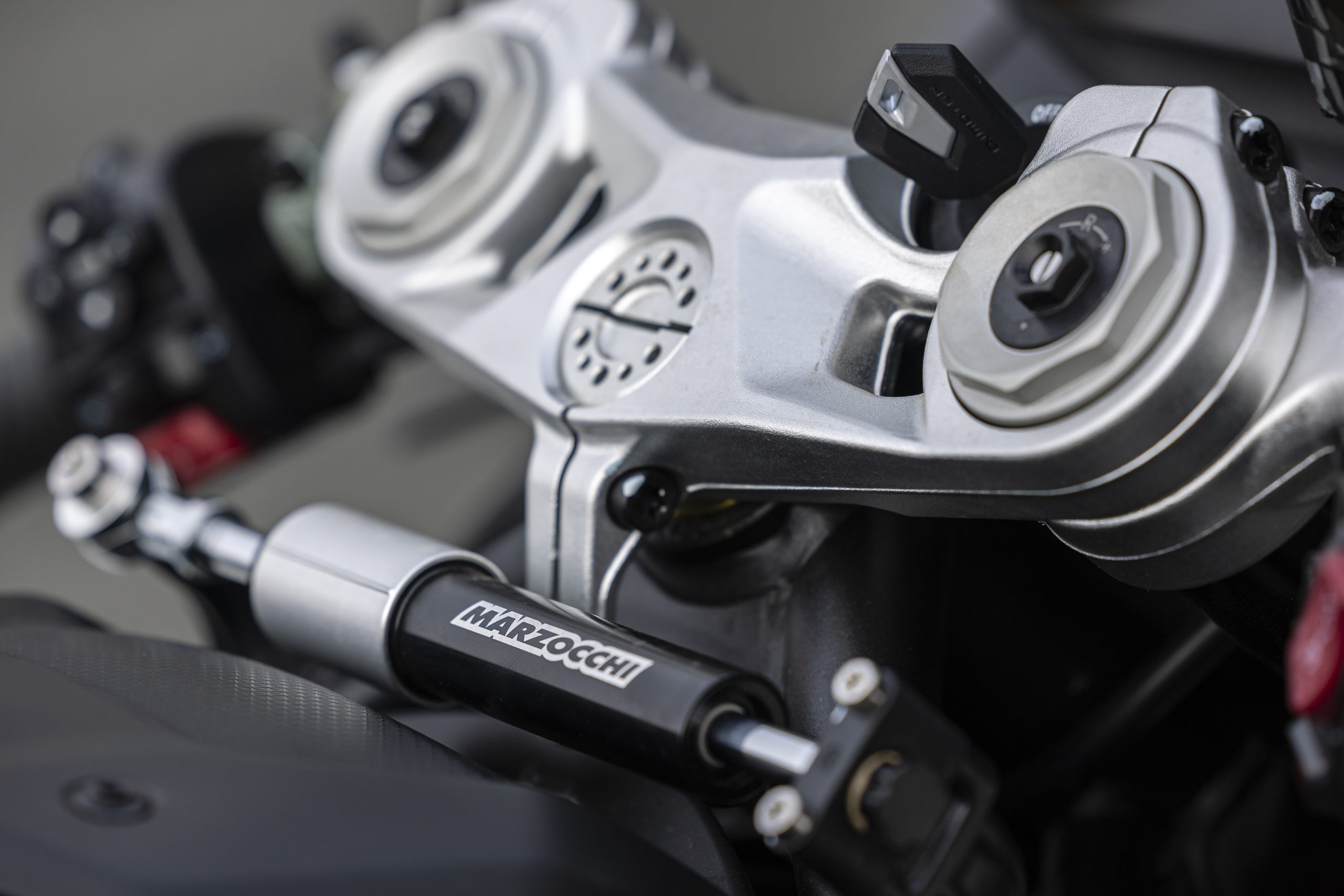 Sterker nog, ook qua gebruikte materialen wappert de Tricolore fier: Marzocchi vering voor en achter, Brembo M50 monoblocs op de voorvork, Brembo radiale rempomp, Pirelli Rosso IV rubber om de fraaie wielen… De productie mag dan in China plaatshebben, de voertaal is Italiaans. Tot aan het kleine Italiaanse vlaggetje op de tank toe, achter het 912 RR-logo. Ook de enkelvoudige swingarm, het achterwiel, de kenmerkende gestapelde uitlaatjes (MV’s handelsmerk) en zelfs de carterdelen zullen bekend voorkomen. En het ruikt niet alleen naar MV, het ís deels ook MV.