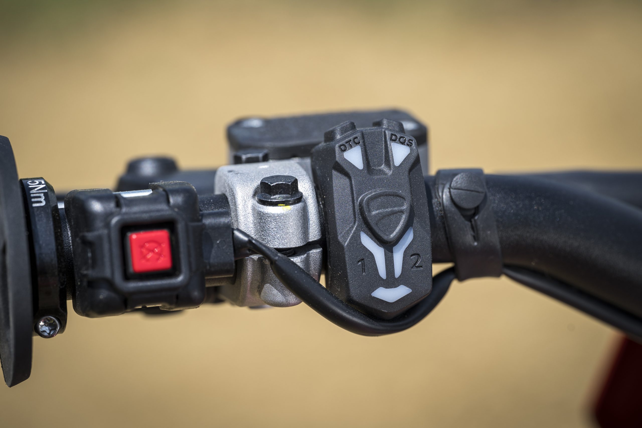 Voor het testwerk heeft Ducati z’n spreekwoordelijke tenten opgeslagen op de Horensbergdam in Genk. Geen zwaar laaglands zandcircuit, maar een omloop met fraaie sprongen en bochten op een harde leemondergrond met een ‘topping’ van losse gravel. Minder hard werken voor de rijder en ideaal om het karakter van het nieuwe 450cc motorblok te ontdekken. En dat die krachtbron anders en uniek is, merk je al in het eerste rondje. De Desmo biedt de rijder de keuze uit twee rijmodi: ‘standje vriendelijk’ en de ‘vol vermogen’ optie, allebei eenvoudig en duidelijk te vinden op de bescheiden knoppenwinkel op de linker stuurhelft.