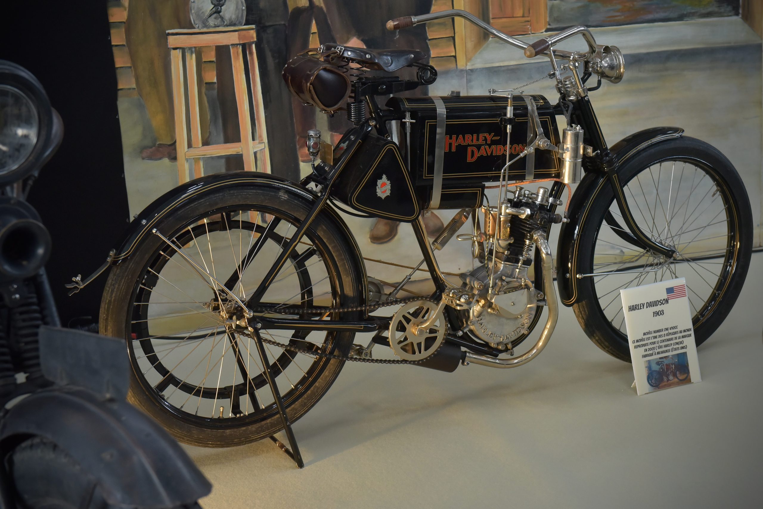 En misschien nog eentje om de ‘uniekheid’ van deze tentoonstelling extra te duiden. Naar aanleiding van de honderdste verjaardag van het merk liet Harley-Davidson in 2003 acht exacte replica’s bouwen van de Harley-Davidson Number One uit 1903. En jawel, één van die acht replica’s staat in Château-Gontier-Sur-Mayenne…